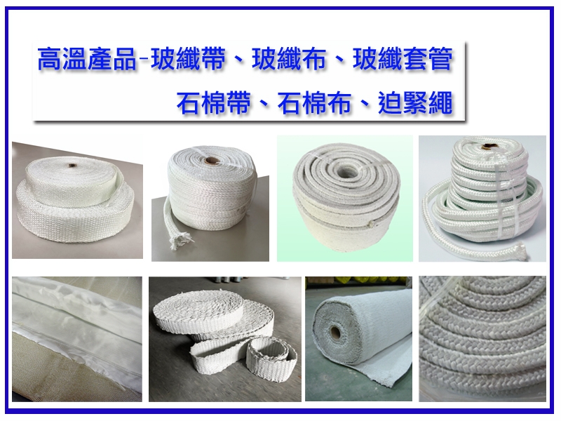 玻纖帶、玻纖布、玻纖套管、玻纖迫緊繩、玻纖繩、石棉帶、石棉布、石棉迫緊繩等耐高溫玻璃纖維製品、石棉製品,適用於高溫軟管保溫、高溫機械填縫等。
